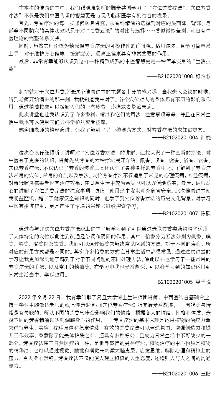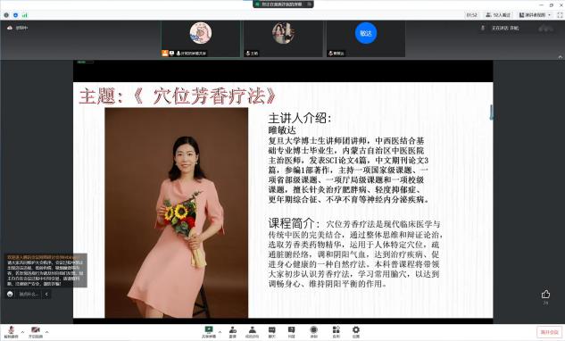 2022922日,我们有幸邀请到复旦大学博士生讲师团讲师,中西医结合基础专业博士毕业生雎敏达老师为我们进行了一场线上的健康讲堂:《穴位芳香疗法》。旨在带领大家初步认识芳香疗法,学习常用腧穴,以达到调畅身心、维持阴阳平衡的作用。