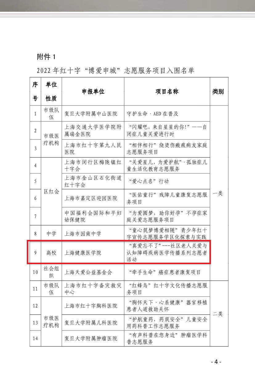 喜讯:“社区老人关爱与认知障碍疾病医学传播”项目入围2022年上海市红十字“博爱申城”志愿服务活动一类项目