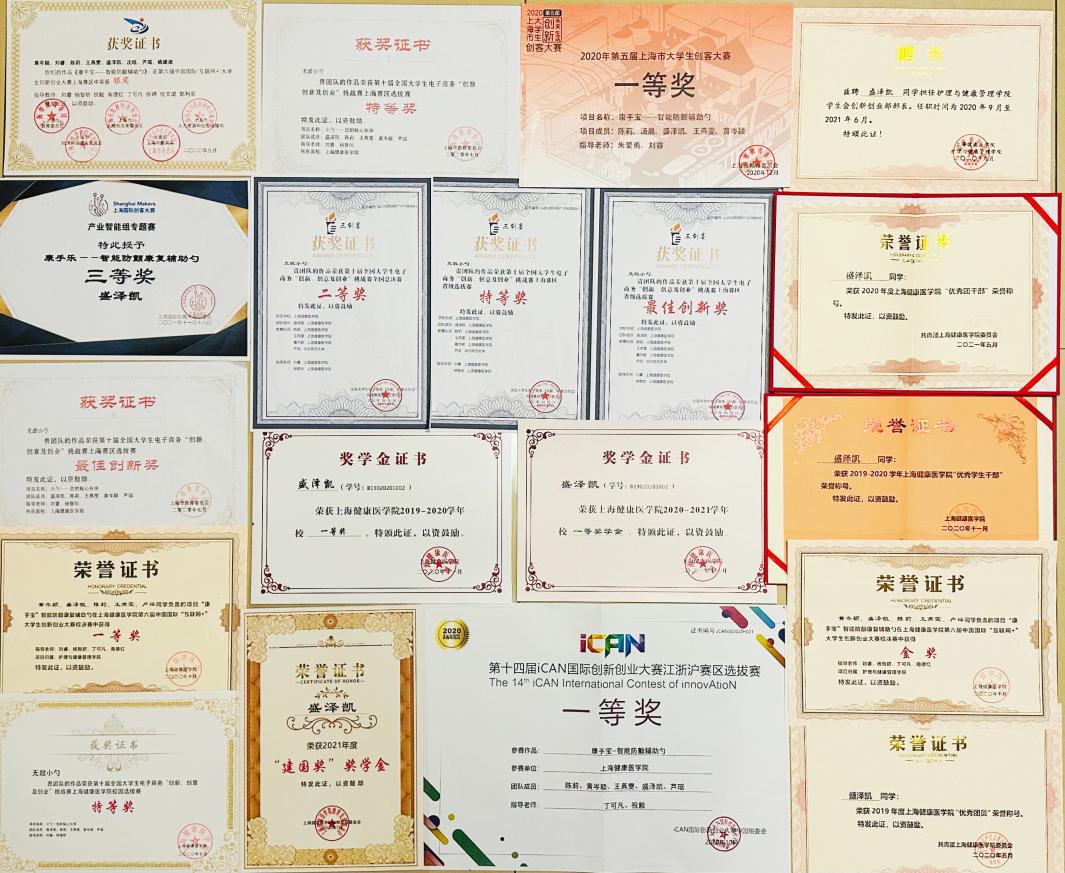 盛泽凯,19级健康服务与管理(本科)1班,担任班级班长,公司创新创业部部长。获三次校一等奖奖学金、一次建国奖学金,上海市奖学金,发表三篇国家级省级期刊论文。自学互联网运营以及产品设计有关的知识,考取相关技能证书九本,申请六项实用新型专利、一项发明专利,带领团队获三创赛市赛特等奖、最佳创新奖,国赛二等奖、互联网加银奖两项等十八项市级国家级奖项。学习急救知识,参与编写书籍《居家急救小宝典》。