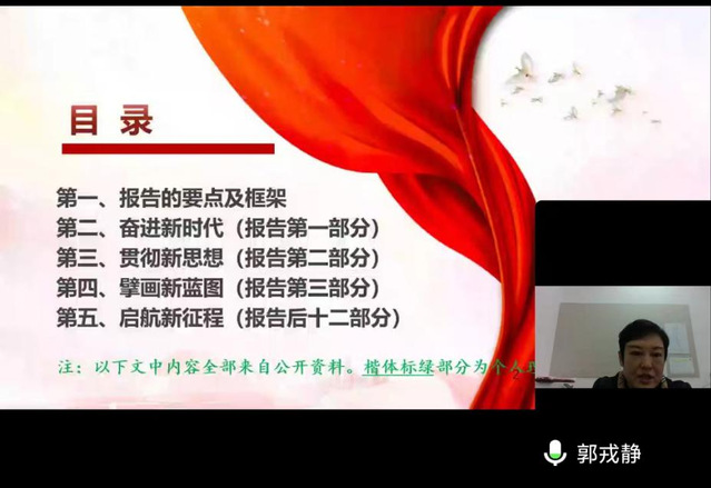 郭戎静首先分析了“报告的要点及框架”,深刻认识大会召开的意义与主题、然后分别以“奋进新时代”、“贯彻新思想”、“擘画新蓝图”、“启航新征程”四个方面详细导读,分享学习感悟。她指出,党的二十大报告总揽全局、气势恢宏,思想深邃、内涵丰富,通篇贯穿坚定的信念追求、强烈的使命担当,更是推动中国特色社会主义不断前进的政治宣言、理论纲领和行动指南。