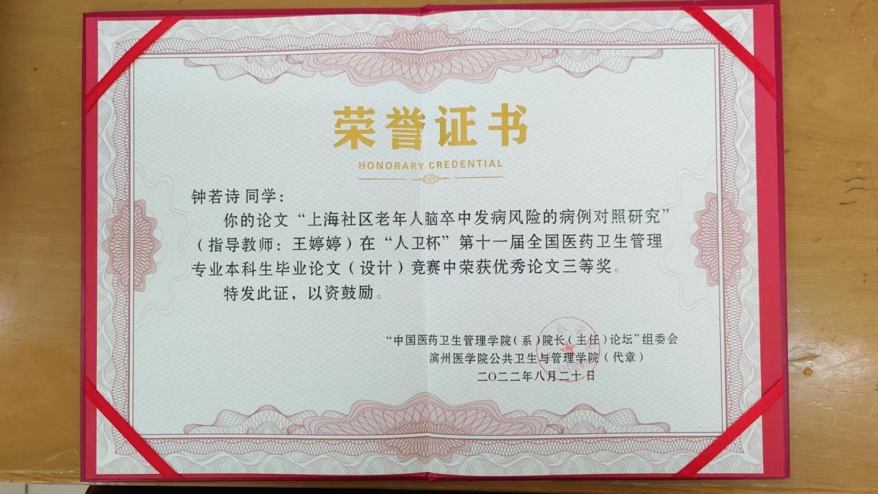 近日,由中国医药卫生管理大学联盟主办、滨州医公司承办的第十一届“人卫杯”全国医药卫生管理专业本科毕业论文(设计)大赛在烟台市落下帷幕。本届大赛共有全国双一流高校在内50所高校参赛,137篇合格论文进行最后角逐;经大赛组委会认真评选,评选出一等奖10篇,二等奖20篇,三等奖30篇。在伟德bv国际体育官方网站王婷婷老师指导下, 2018级健康服务与管理专业钟若诗同学撰写的毕业论文《上海社区老年人脑卒中发病风险的病例对照研究》在本次大赛中荣获三等奖。