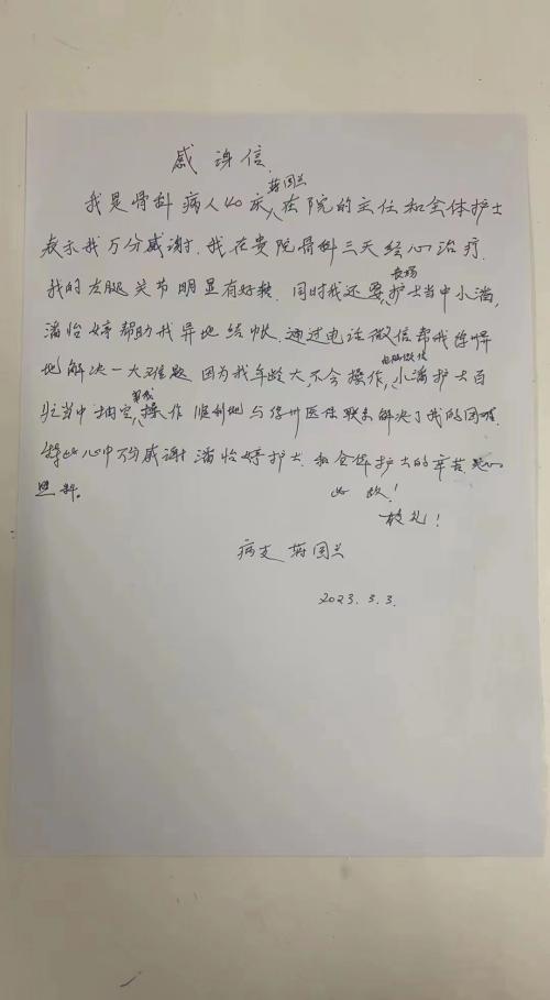 2023年3月1日,在骨科实习的潘怡婷同学上班过程中,了解到一位患者因不太会进行电子产品的使用,而无法解决异地医保的问题。潘怡婷同学便主动联系了异地医保,并及时解决了患者的燃眉之急。患者表示,十分感谢小潘护士为她解决了一大难题,为此她还特意写了一份感谢信送到科室致谢。事后回想当时情景,潘怡婷同学表示:“这是我们作为实习护生力所能及的一件小事,但在患者心中留下了深刻的印象,对于我而言,患者的感激之情使我非常触动。这也更让我感受到了护理行业,是以患者的需求为实质的。这代表着我们不仅要磨炼自己的专业水平,还要关注患者的需求以及他们的心理健康,只有不断、全面地提升自己才可以给患者带来更好的护理。我希望在将来的工作中我也能在自己的岗位上发光发热,继续学习,努力地提升自己,做一名合格的护理人员。”