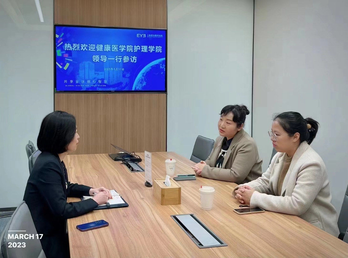 3月17日,伟德bv国际体育官方网站护理与健康管理公司党总支副书记薛文正和就业专员吉洁走访了上海爱尔眼科医院,与爱尔眼科医院的人事总监潘智莱进行了广泛交流。