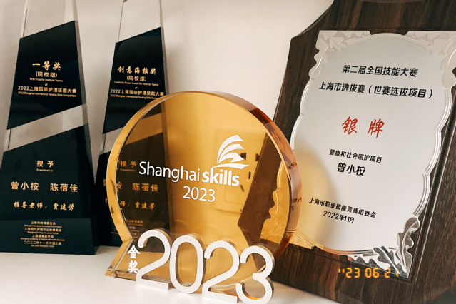 “现在回头看来时的历程,没有想到能走到今天这一步。以前看到公众号推送的报道,吴怡欣师姐在第46届世界技能大赛特别赛中夺得铜牌,实现了中国在该项目上零的突破,实在振奋人心。我明白成功背后需要付出巨大的努力,也将以师姐为目标不断鞭策自己。”而今,曾小桉已在路上。“我的目标就是做到像比赛专家裁判组说的那样——保持照护者的专业性,与患者共情,基于患者的需要和喜好提供帮助,做有温度的照护者。”接下来,她将积极备战,努力提升自己的各方面能力。今年9月,曾小桉将代表上海市出征第二届全国技能大赛健康与社会照护项目,祝愿她乘风破浪,勇往直前。