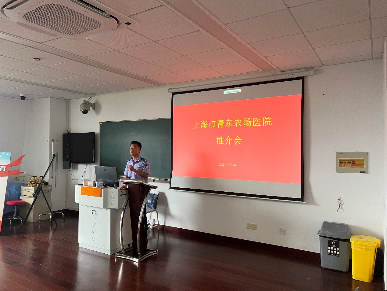 上海市青东农场医院(简称“青东医院”)是一所为全市司法行政系统强制隔离戒毒人员提供医疗保障的一级甲等综合性医院,在编人员属于司法人民警察序列,享受国家公务员待遇,既是白衣天使,又是人民警察。会上青东医院的民警们以播放宣传片、PPT介绍、面对面交流等方式,介绍了青东医院的科室设置、人员配置、工作环境和福利待遇等,从不同视角向同学们展示了青东医院独特的人文与历史。