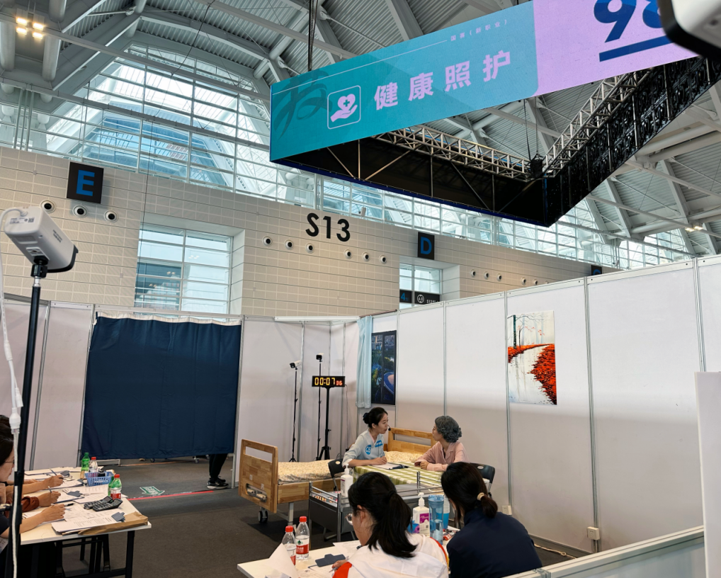 健康照护国赛项目涉及养老机构、医院、社区、家庭四大场景,选手需要根据案例,对场景中的标准化病人进行不同的健康照护任务,不仅考验选手基本知识和技能,对选手的沟通能力、解决问题和创新能力、评估需求和规划照护服务能力以及提供实际照护的综合能力都有非常高的要求。两天半高强度的作业流程,在激烈角逐和紧张的比赛氛围中,上海队林秀怡、陈慧勤两位老师不仅在比赛中沉稳冷静,更是表现出良好的专业技能和心理素质,在整个赛事过程中,体现了大气谦和、海纳百川的上海城市精神和优秀品质。