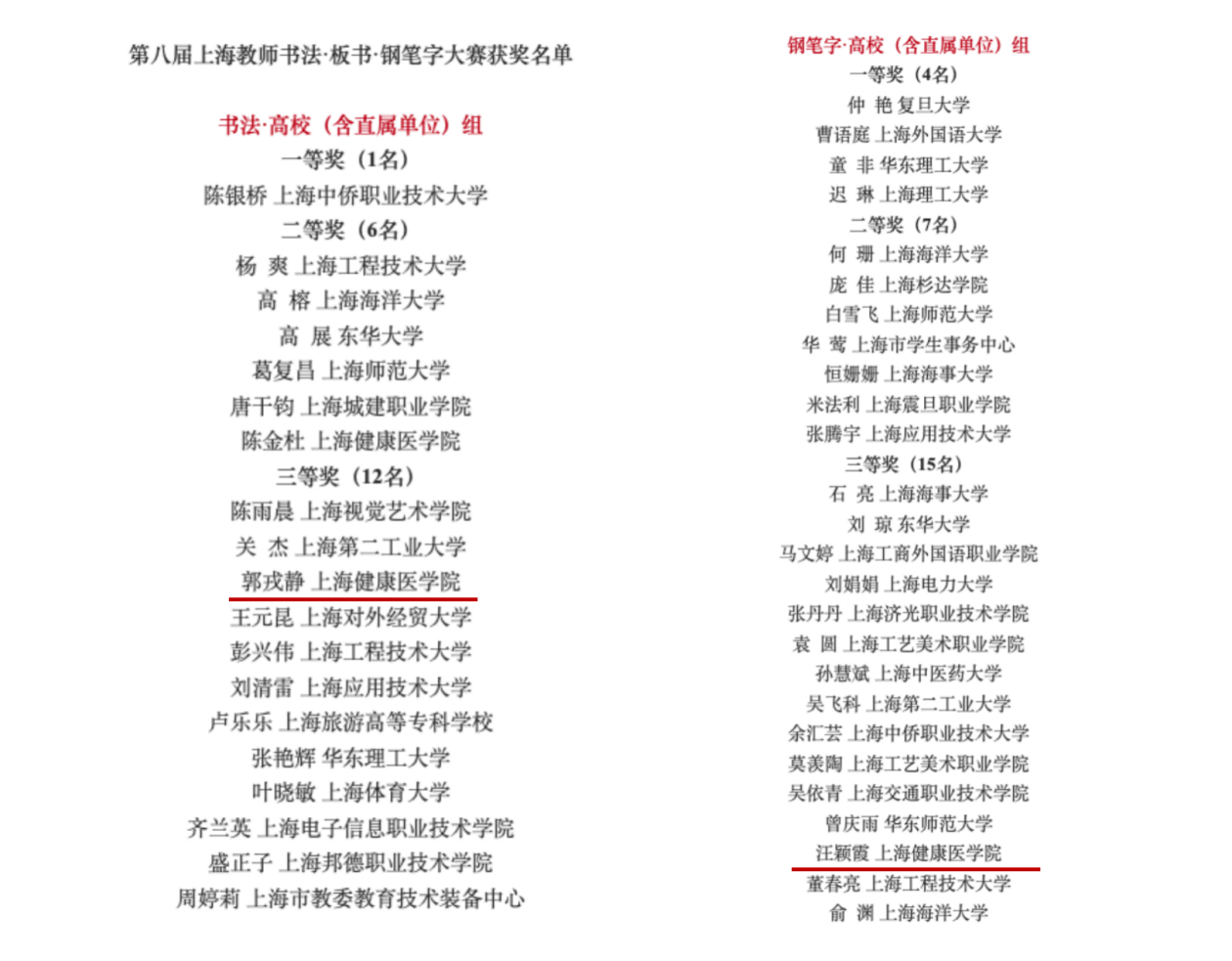2023年10月14日上午,由上海市教育工会主办的第八届上海教师书法·板书·钢笔字大赛在上海第二工业大学举行。来自上海教育系统各高校、区教育工会(含中职联工会)、直属单位共64家单位、333名选手,分别参加了书法、板书、钢笔字三个项目的比赛,共同书写新时代,展示新风采。伟德bv国际体育官方网站护理与健康管理公司党总支书记郭戎静和青年专任教师汪颖霞参与了本届三笔字大赛。