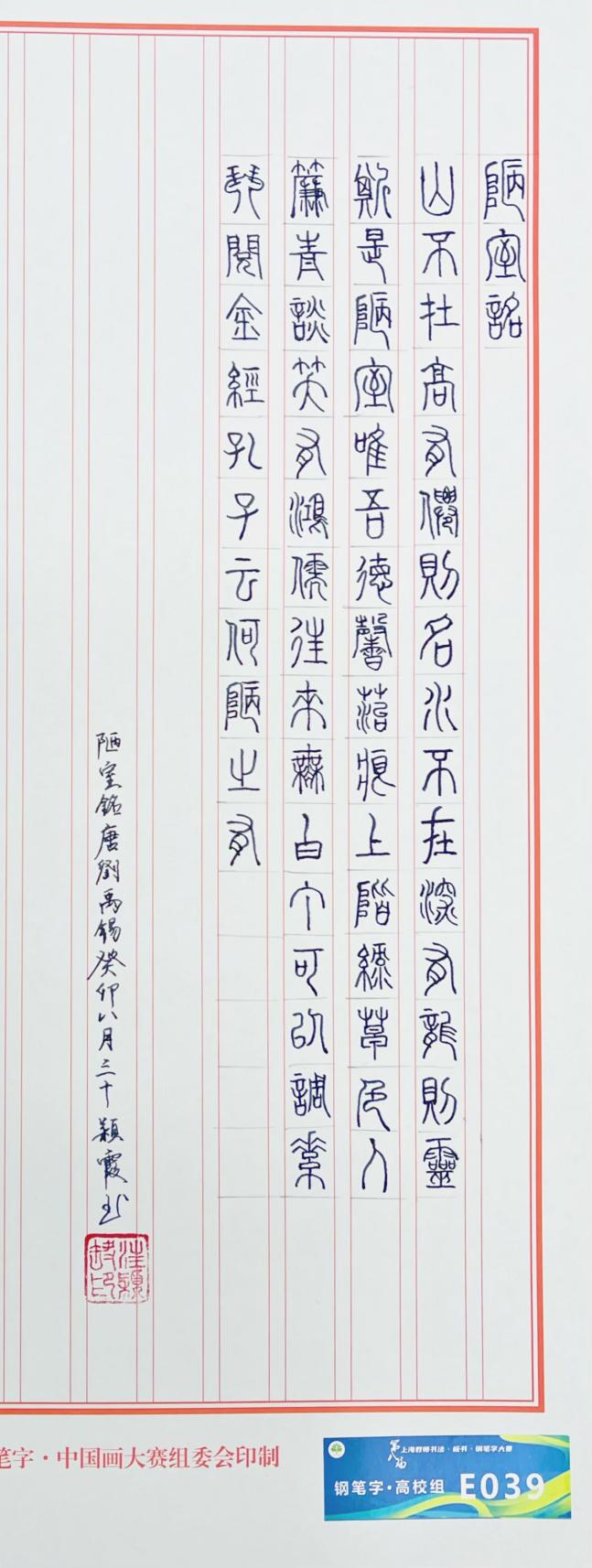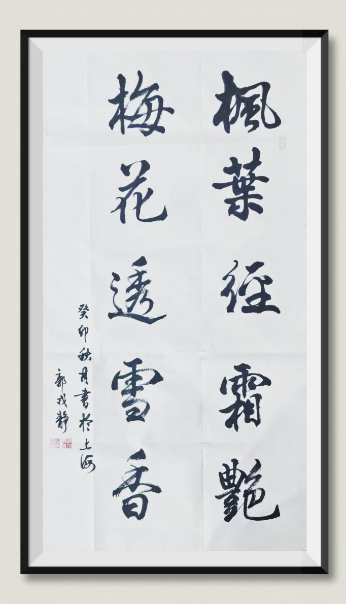 三笔字比赛讲究书法行云流水、一气呵成;板书排版有序、美观大方;钢笔字清晰工整、自然流畅。郭戎静书记和汪颖霞老师平日积极与公司书画协会成员交流切磋,在快节奏的公司生活工作节奏下,依旧能够沉下心来习字练字,琢磨吟味。今年两位老师是第二次参加三笔字大赛,都以更自信洒脱从容的笔力书写了作品。郭戎静书记用行书将“不积跬步无以至千里、不积小流无以成江海”俊逸稳健地表现出来,也体现了本句的内涵:要想达成目标,必须注重点滴积累。想要书写出更好的作品,必然需要日常的训练。自创行书对联作品“枫叶经霜艳,梅花透雪香”韵美遒劲,自然流露出只有历经磨砺和考验的人生才能变得辽阔高远的意境。汪颖霞老师新挑战了硬笔书法,在紧张的1小时内完成了规定作品行楷《醉翁亭记》与自创作品小篆《陋室铭》。经过专家组评定,在本届更严格的获奖比例下,两位老师的作品相比上届都有所进步,均获得了第八届上海教师高校组三等奖。