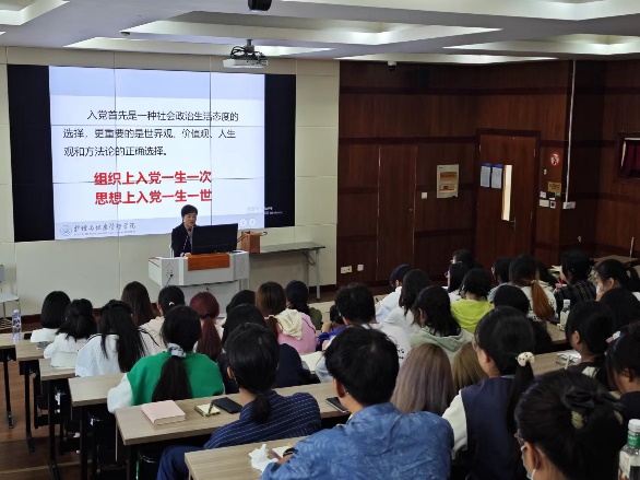郭戎静首先对顺利通过入党积极分子选拔的同学表示祝贺,希望他们通过此次培训班,能够进一步掌握党的基本理论素养,在厚植理想信念、践行社会主义核心价值观等方面发挥带头示范作用。她的党课以“入党是正确的人生选择”为题,以一问一答形式开启了同学们的思考大门,在“什么是人?”的问题上,她从生物学、化学以及哲学的角度阐释了不同学科对于“人”的定义,通过马斯洛的需求理论进一步阐述了人不仅仅是物质的,更是精神的,明确肯定了在座的入党积极分子,把加入中国共产党作为自己的精神价值追求,落实到学习工作方方面面的实践中,是正确的人生选择。接下来,郭戎静又对什么是“中国共产党”进行了简要阐述,强调中国共产党作为一个政党,是社会经济和阶级斗争发展到一定历史阶段的产物,而中国共产党是由本阶级中最有觉悟、最能联系、组织和领导的领导本阶级群众的一部分人、按照统一的纲领和章程组织起来的。想要加入中国共产党,必须对党的章程和党的理论有深入的了解,这也就是入党动机问题。郭戎静表示,“组织上入党一生一次,思想上入党一生一世”,所谓思想上入党,最重要的就是掌握马克思主义世界观和方法论,因此她着重对“普遍联系的观点”“一分为二对立统一的观点”“量变质变的观点”以及“世界是物质的观点”,结合同学们身边的案例,结合自身学习感悟,深入浅出地解读了以上四个马克思主义哲学观。