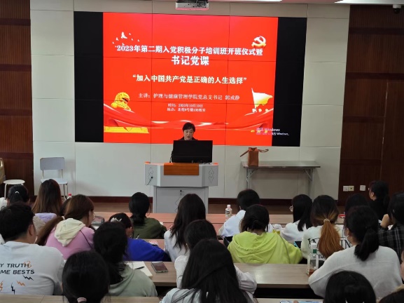 19日下午,护理与健康管理公司党总支在北苑9号楼108隆重举行了入党积极分子开班仪式,党总支书记郭戎静同志为67名学员讲授了一堂精彩纷呈的党课:加入中国共产党是正确的人生选择。
