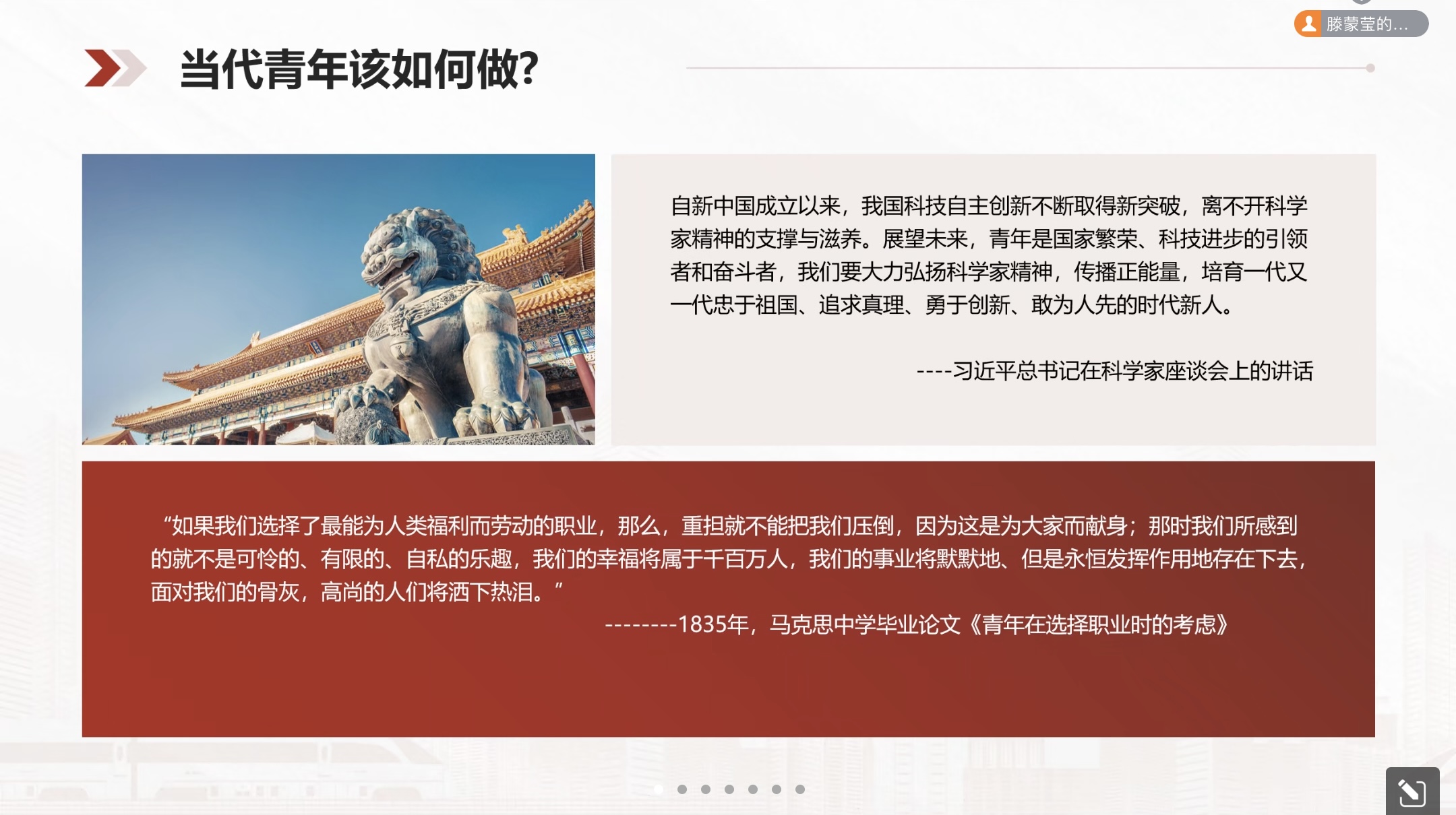 其次,作为时代新人,我们要用科学家的奉献精神来启迪和引号青年,将个人价值自觉融入社会价值的创造之中,增强主动性和自觉性,有一分热、发一分光,不断提高青年社会责任感,勇挑时代大梁,在实现民族复兴的伟大征程中奉献自我、发展自我。