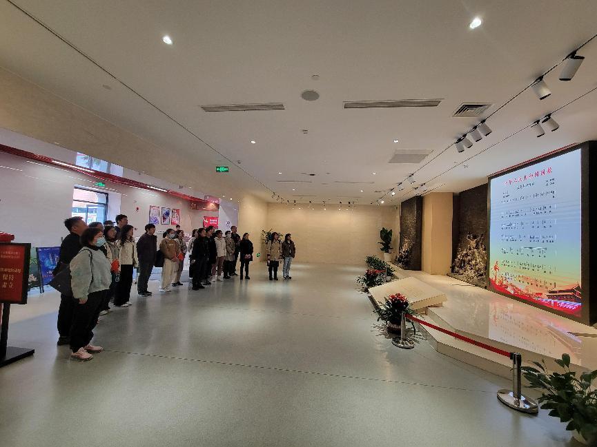 首先,在国歌展示馆的序厅,大家庄严肃立,共唱国歌,在嘹亮的国歌声中,共同感受着万众一心、奋勇向前的精神。进入展馆,大家开始参观学习。通过观看一件件历史文物和一幅幅照片,聆听一个个关于国歌的感人故事,共同了解《义勇军进行曲》诞生的背景和过程、国歌背后的故事,了解老一辈革命家所做出的杰出贡献,感受着国歌所蕴含的精神力量。最后,大家在环幕影厅共同观看了短片《行远不忘初心》,它以“起来、前进、万众一心”为主题,讲述着从民族危亡时刻到新中国建设时期,在国歌精神的鼓舞下,全国人民团结一致、奋勇向前的故事,诉说着国歌诞生到初心不改的国歌情怀。