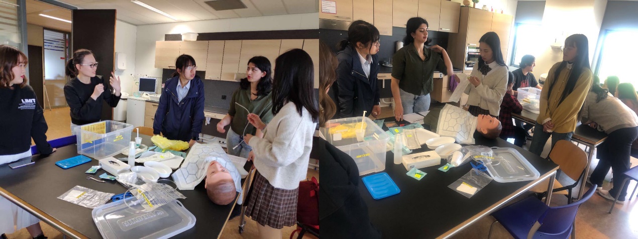 在RUAS大学,两位负责老师特地准备了与同学们交流沟通的小游戏,由此鼓励同学们多开口说英语,RUAS集团的员工们分别为他们演示了鼻饲和肌肉注射的用物和操作流程,在老师的带领下,还参观了员工的护理实训课,同学们了解到了荷兰在护理操作过程中,非常注重与病人的沟通、健康教育与心理教育等。
