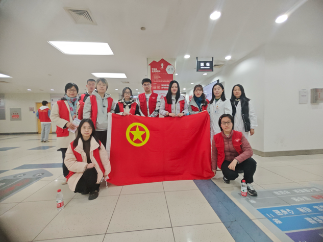 志愿者中的23级健康服务与管理专业的老员工给前来就诊的小朋友们介绍健康小知识,并与医院医护人员共同向住院患儿派送暖心小礼物。