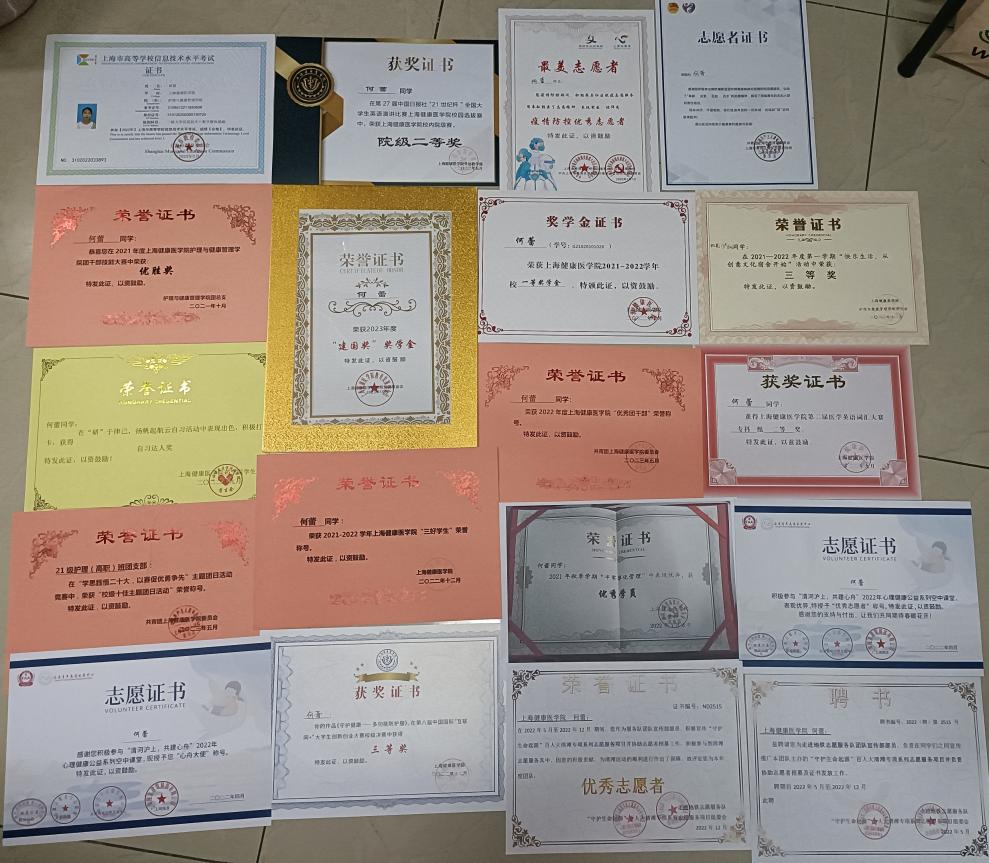 曾获2022-2023学年国家奖学金、2023年度“建国奖”奖学金、连续2年校一等奖学金、2021-2022学年校“三好员工”、2022年度校“优秀团干部”、2022年“清河沪上,共建心舟”心舟大使、优秀志愿者、2022年 疫情防控优秀志愿者、2022年 “研”与律己,扬帆起航云自习活动 自习达人奖、2021年“半军事化管理”优秀学员,2023年上海市“星光计划”职业院校技能大赛“健康与社会照护”项目一等奖、2022年第七届“亿学杯”全国老员工英语词汇及综合能力大赛省三等奖、2022年第二十七届中国日报社“21世纪杯”全国老员工英语演讲比赛院级二等奖、2022-2023学年 第八届中国国际“互联网+”老员工创新创业大赛校级决赛三等奖、2022年第二届医学英语词汇大赛校二等奖、2021年 校团干部技能大赛优胜奖、2023年“学思践悟二十大,以赛促优勇争先”“校级十佳主题团日”。