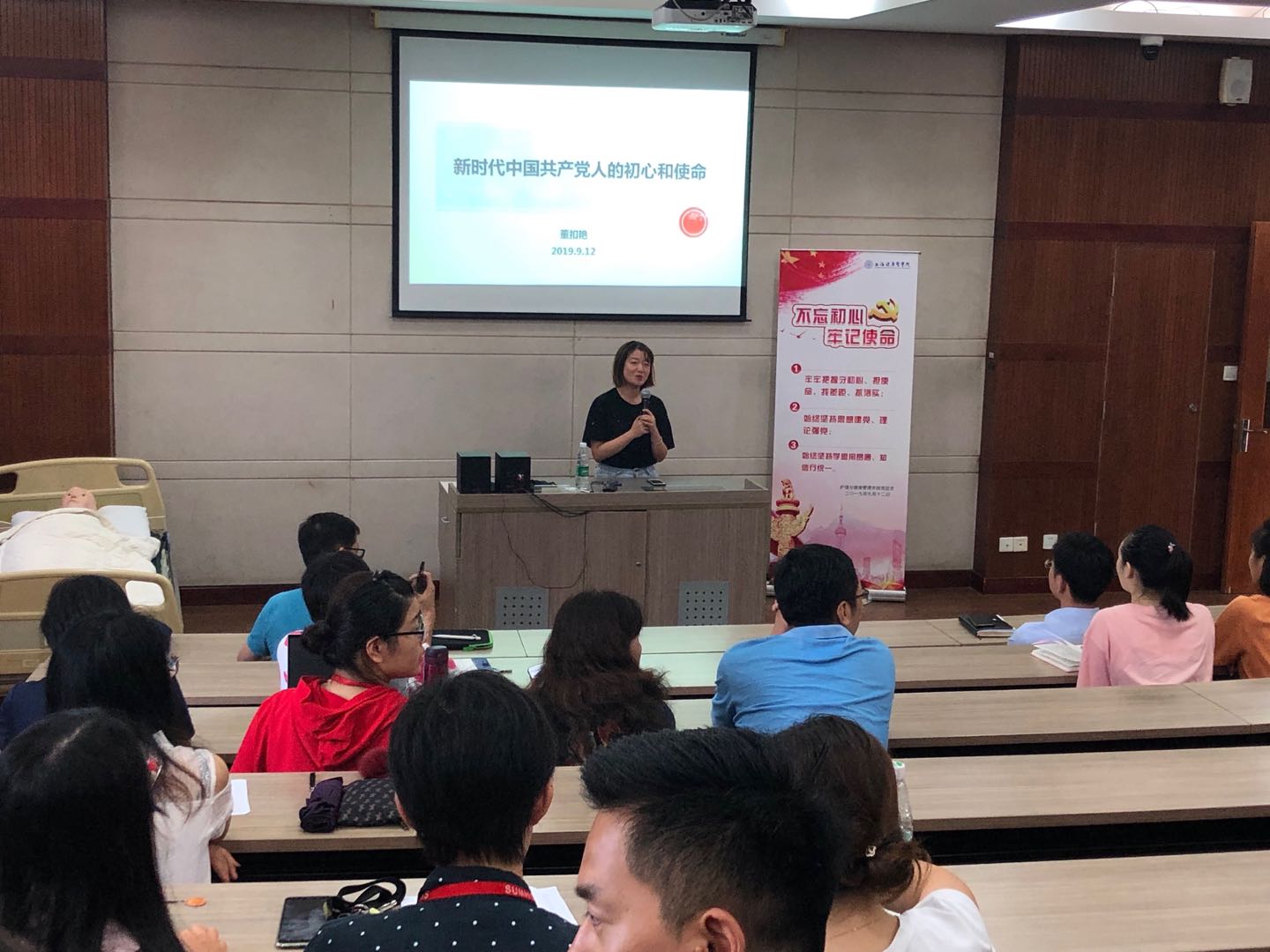 董扣艳以三个问题贯彻整个报告的始终,旁征博引,以大量史实为线索,富有激情的讲授。一是“初心和使命是什么?”她从“红船精神”,“井冈山精神”,“改革开放精神”等党和国家不同时期所涌现的精神讲起,引出新时代中国共产党人的初心和使命是“为中国人民谋幸福,为中华民族谋复兴。”二是“为什么不能忘记初心和使命?”,她从当前党和国家所处的大环境大背景谈起,尤其是十八大以来,党和国家所面临的机遇和调整,要求共产党人坚定初心、不辱使命;三是“如何不忘初心、践行使命?”,她结合健康事业,介绍了时代楷模王逸平的生动案例来诠释。