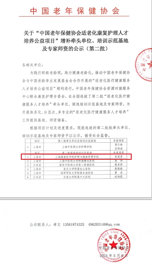 近日,中国老年保健协会发布了《关于“中国老年保健协会适老化康复护理人才培养公益项目”增补牵头单位、培训示范基地及专家团队的公示(第二批)》,伟德bv国际体育官方网站入选第二批培训示范基地,经理朱爱勇入选专家团队。