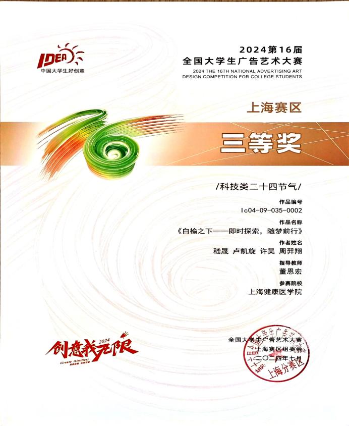 公司党建+AHFE团队在核心负责人董恩宏教授的指导下,先后在大广赛校赛和大广赛市赛中斩获佳绩。团队在设计的过程中将AI赋能乡村振兴的美好愿景与中国传统的二十四节气相结合,团队成员嵇晟、卢凯旋、许昊和周羿翔共同创作的作品《白榆之下--即时探索,随梦前行》,以仅次于前两支来自于上海大学的员工团队的名次,取得公司本次在该赛道上的最高成绩,最终荣获科技类二十四节气上海市三等奖,成功实现公司在该赛道的首次突破。