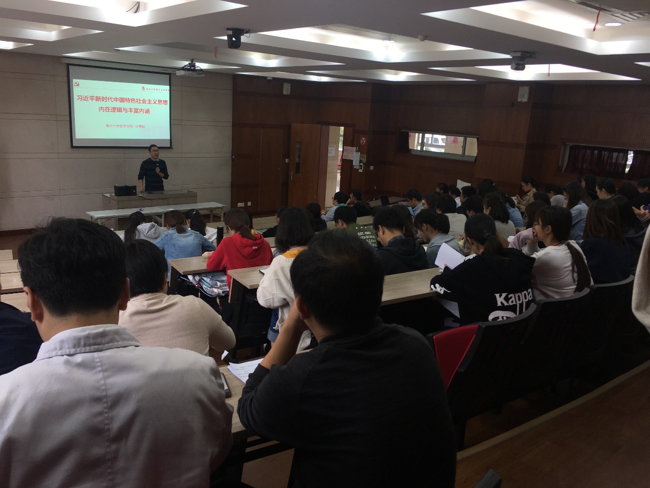 田博毅老师的授课以习近平新时代中国特色社会主义思想的产生背景、产生过程及思想内涵为主线,首先带领大家回顾了世界社会主义五百年与马克思主义中国化的历史进程,进而引出“为什么”习近平新时代中国特色社会主义思想是马克思主义中国化的最新成果,理论根源“从哪里来”的问题。他又从十九大报告的产生过程来分析,指出了新时代中国特色社会主义思想到底“是什么”、“怎么办”的问题,最后指出习近平新时代中国特色社会主义思想是指明党和国家向“何处去”的根本指南。
