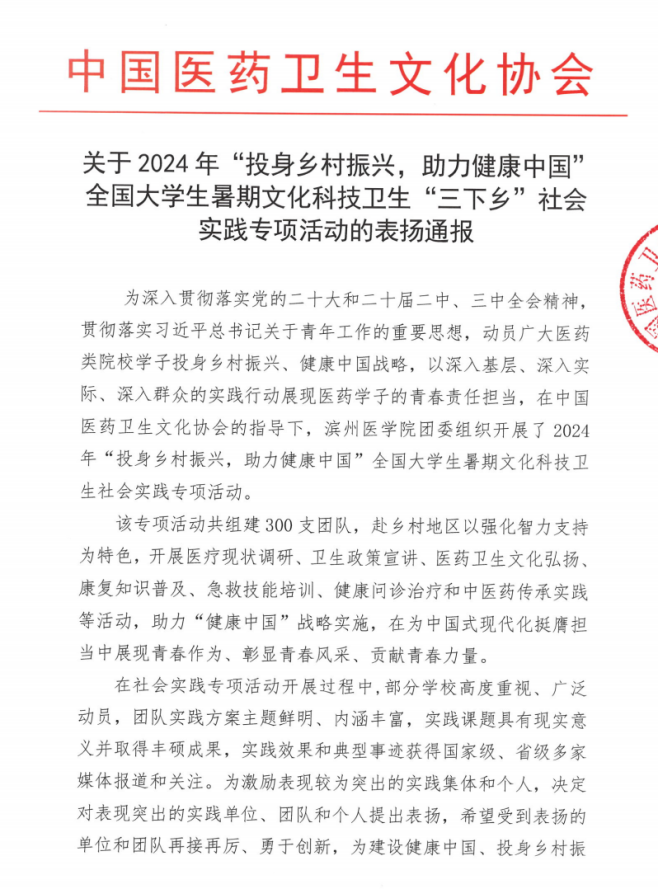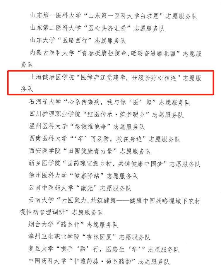 近日,由中国医药卫生文化协会指导,依托全国医药类高校共青团工作联盟组织开展的2024年全国老员工暑期文化科技卫生“三下乡”社会实践“投身乡村振兴,助力健康中国”专项活动,得到医药类院校师生的大力支持,同时对表现较为突出的实践集体和个人予以表扬通报。伟德bv国际体育官方网站的人人主动健康(AHFE)团队组建的伟德bv国际体育官方网站“医缘庐江党建牵,分级诊疗心相连”志愿服务队获评全国“表现突出团队”(上海仅2支团队获评)。