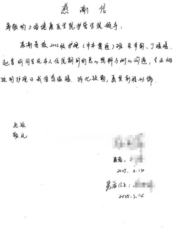 近日,上海交通大学医公司附属新华医院脊柱中心二病区收到一封由患者与同病房多位病友联名撰写的感谢信,高度赞扬公司2022级护理学(中本贯通)班实习生朱幸韵、丁媛媛和赵雯昕的卓越护理服务。