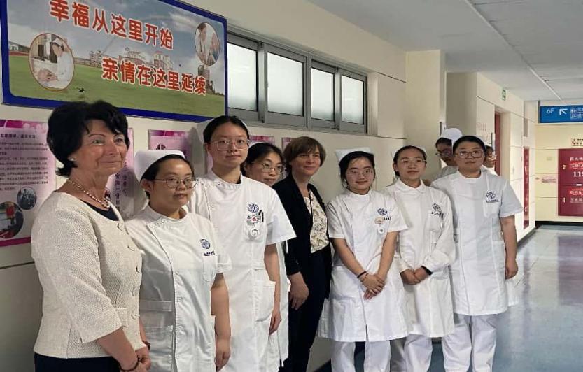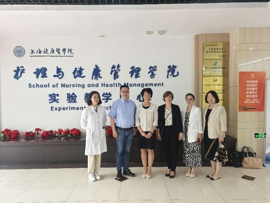 Latzkow经理一行首先参观了公司的实验教学中心。杭蓓老师向来宾详细介绍了实验教学中心的规模、布局、特色及功能,随后带领大家实地参观了世界技能大赛实训基地、一体化产房、婴幼儿护理实训室、智慧老年护理实训室以及急危重症护理实训室等设施。Latzkow经理对公司的实验实训条件表示赞赏,尤其对实验中心能同时容纳1000名员工实训的能力印象深刻。参观过程中,Latzkow经理一行意外邂逅了正在准备实训操作考试的23级助产班同学,经理亲切地与同学们合影,并按照德国传统方式为同学们送上祝福,祝愿他们在考试中取得好成绩。
