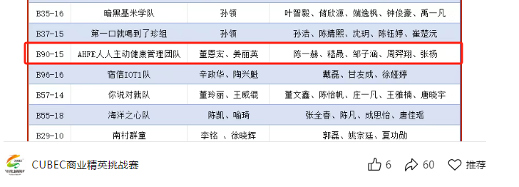 自2024年8月团队内部试行该模式以来,AHFE人人主动健康管理团队始终秉持立德树人理念,坚持以竞赛过程表现与成果真实性为核心筛选标准,注重竞赛的过程性和个人成长性,致力于将竞赛打造为真正的实践育人平台。团队尤其重视学风建设,对团队成员进行了引导与优化,着力营造潜心钻研、追求卓越的团队氛围。 通过上述举措,团队迄今已成功孵化项目7项,相关成果斩获包括2025年中国国际老员工创新大赛上海市金奖、2025年大广赛上海市金奖、2025年上海市“挑战杯”二等奖等在内的20余项竞赛奖项,并在多项教育部榜单赛事中实现历史性突破。未来,团队将持续深化“以赛育才”机制,推进课程创新与竞赛体系的深度融合,为健康服务领域输送更多复合型创新人才。