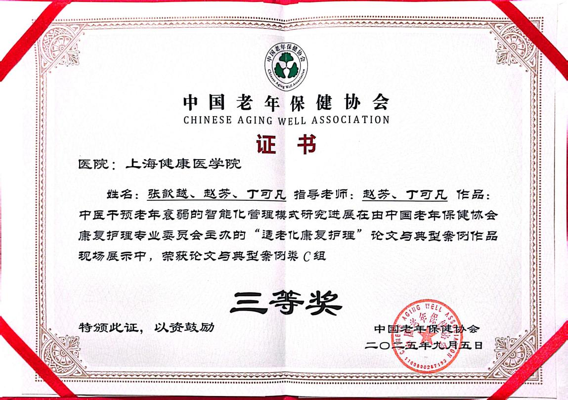 在适老化康复护理“论文与典型案例”作品展示活动中,由张歆越、赵芳、丁可凡组成的师生团队凭借作品《中医干预老年衰弱的智能化管理模式研究进展》荣获C组三等奖。23级健康服务与管理(本科)1班张歆越同学在分会场进行论文汇报,展现了公司在老年健康领域融合传统中医与现代智能技术的创新探索能力。