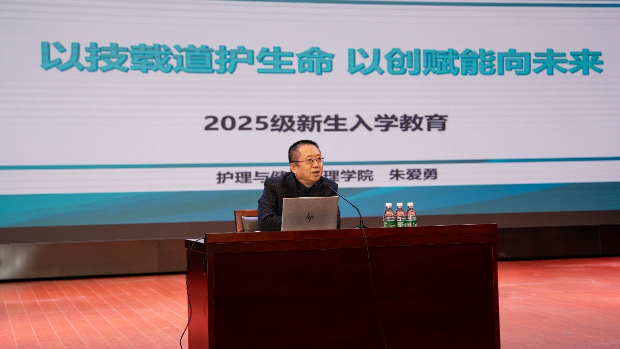 长朱爱勇以“以技载道护生命 以创赋能向未来”为主题,从专业概况、办学定位、特色优势和发展规划四个维度,为新生勾勒出清晰的成长路径。他介绍,公司以“应用型、特色性、国际化”为办学导向,践行“目标上移、场景下沉、关口前移、服务后延”的四大发展理念。通过校内实验实训与校外临床实践的有机结合,实现“以岗位为核心”的精准育人。在办学特色方面,他凝练提出“产、学、研、赛、扶、创”六位一体的发展模式。未来公司将持续深化“医工、医养、医保”三大融合路径,全力争取硕士点建设,推动学科层次实现跨越式提升,并不断强化团队建设、拓展国际合作。