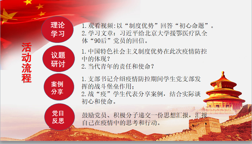 首先是理论学习,大家先集体观看了徐艳玲老师的以“制度优势”回答“初心使命”的教育视频,从党中央的集中统一领导和众志成城当中,更进一步了解到了社会主义的制度优势:其一,有了核心就有了“定海神针”;其二,有了全民动员就盘活了“中国力量”;其三,有了舆论引导就强了信心、聚了民心。随后中共预备党员嵇文颖同学朗读了《习近平给北京大学援鄂医疗队全体“90后“党员的回信”》激励广大青年应担当尽责、努力奋斗,让青春在党和人民最需要的地方绽放绚丽之花。
