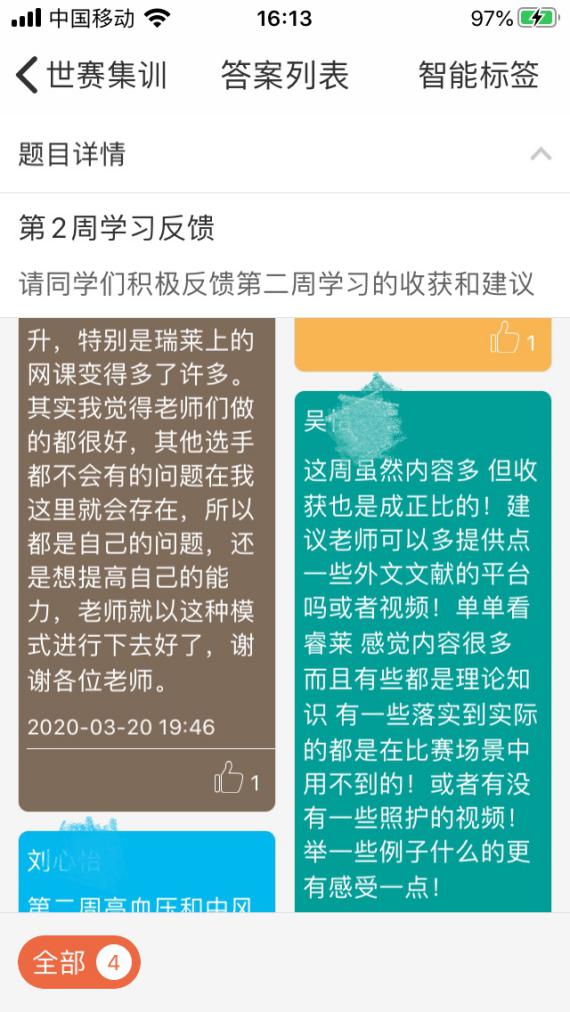 13:30-16:30选手按照闯关模式进行网课资源的学习,每一小节结束后都会有测试题目,闯关的模式和课程积分激发了选手们克服困难、勇攀高峰的内动力。一天的课程接近尾声了,教练又一次开启了腾讯会议直播平台,这次不是答疑,而是选手展示各自的学习成果。小刘展示了他的健康教育海报,图文并茂;小吴分享了PPT整理,用英语流利的展示了她的观点;小张分享了思维导图,思路清晰,条理分明……教练分别针对选手的展示一一进行点评,肯定优点,提出继续努力的方向,选手欣然接受。