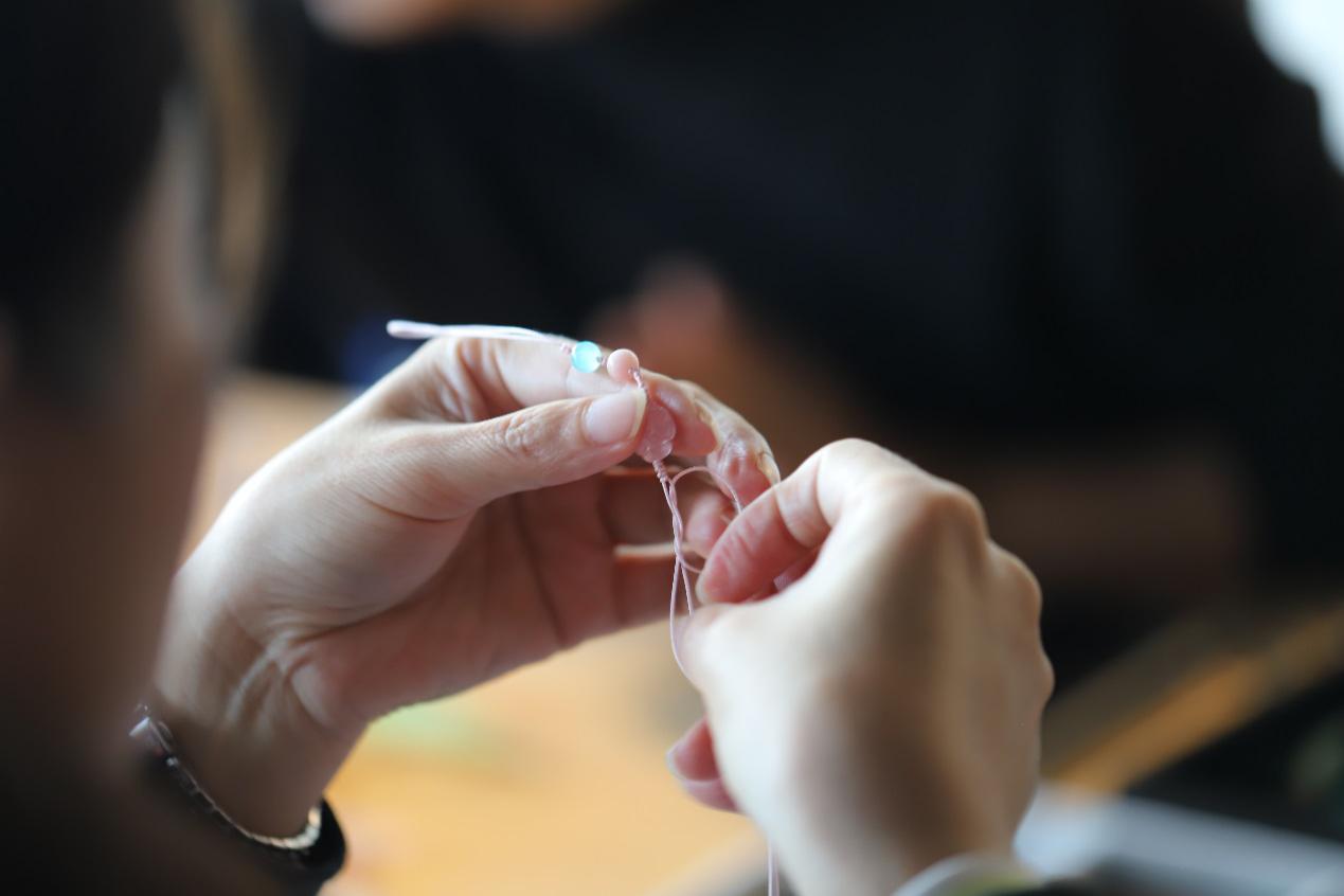此次茶座分为两部分。第一部分为团建活动:愿世间美好与你环环相扣——串珠体验,老师们在技师的指导下,学习打结、串珠、做流苏。随着一双手的律动,绳结和小物件在老师们的巧手中诞生,并变得生动、精美。在这温暖的午后,有阳光、有朋友、有交流,有放松,好不惬意。