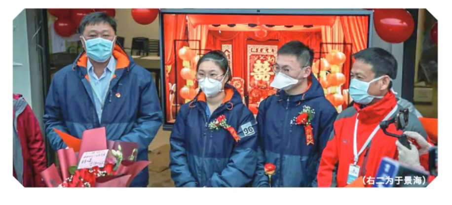 2月28日晚,来自上海交通大学医公司附属仁济医院肝移植监护室的于景海护士和消化科的周玲亿护士,在战友们的祝福和见证下,终于“如期”举行了婚礼。雷神山医公司党委书记、经理王行环,上海第八批援鄂医疗队总领队、仁济医院副经理张继东为他们证婚,全国12支医疗队代表作为亲友团参与。这也是雷神山医院的第一场婚礼。