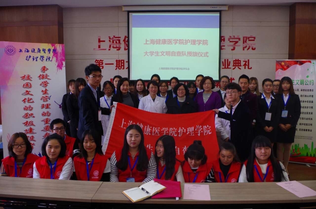 2016年12月5日中午12点伟德bv国际体育官方网站护理公司老员工文明自查队授旗仪式在北苑9号楼106教室顺利完成。护理公司党总支书记方秀琴老师,护理公司副经理陈荣凤老师,护理公司副经理蒋颖老师,护理公司党总支副书记薛文正老师以及各位辅导员老师受邀出席本次仪式,由护理公司团总支副书记宋飞老师担任主持。