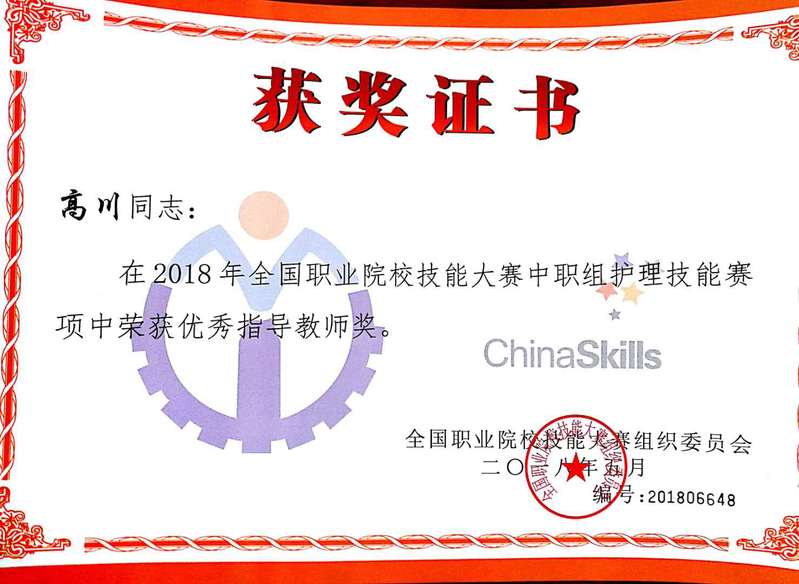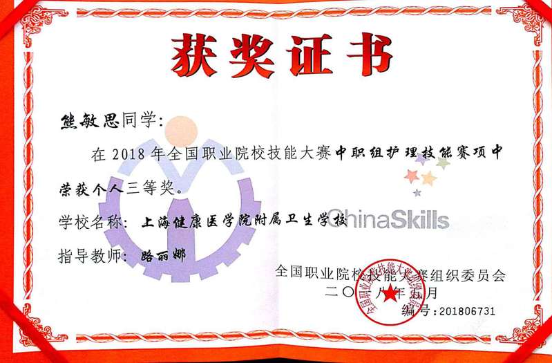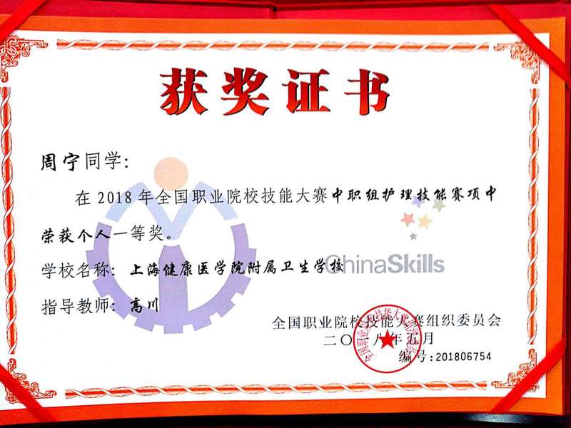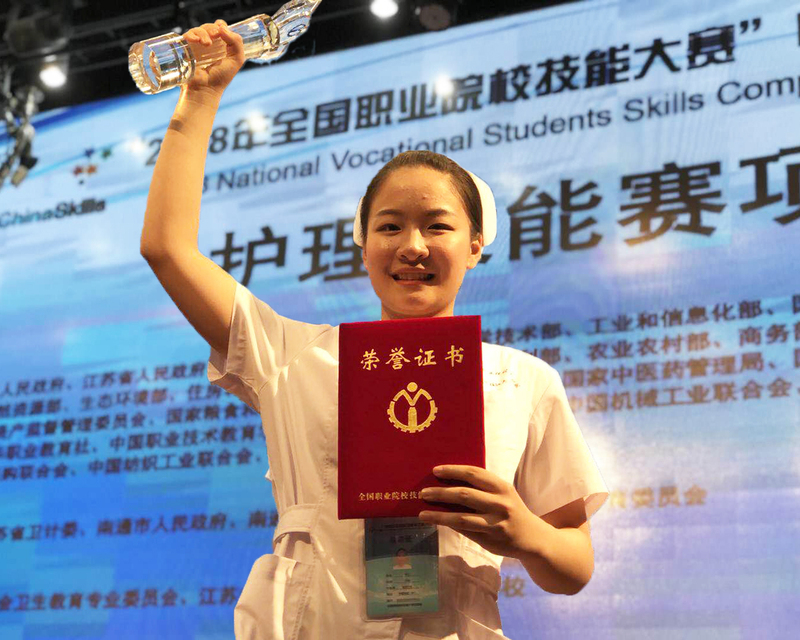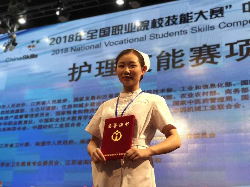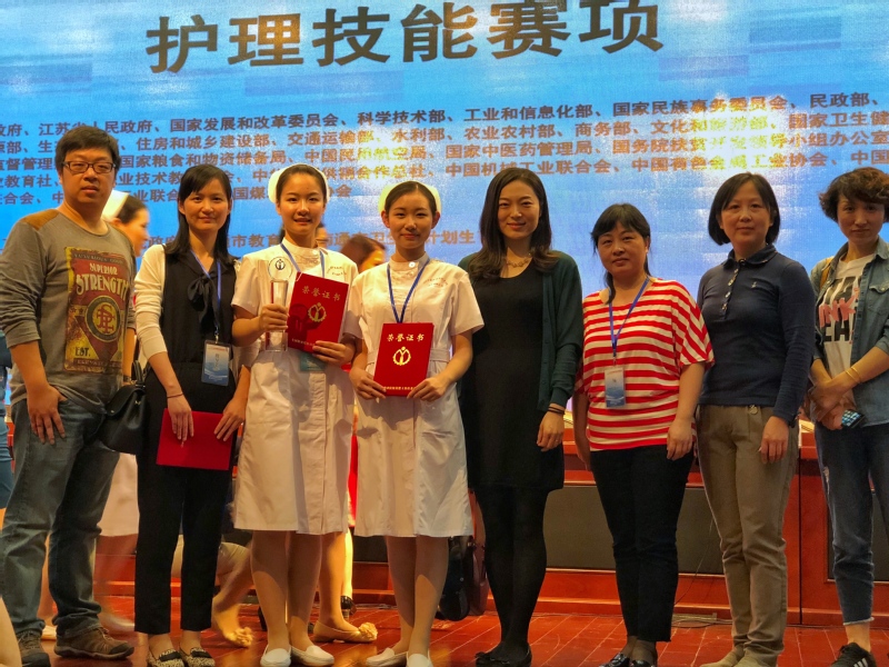 5月24日,2018年全国职业院校技能大赛中职组护理技能赛项在江苏省南通卫生高等职业技术公司闭幕,经过3天的激烈角逐,公司2015级护理专业中高职贯通班员工周宁代表上海队在33支省市参赛队157名参赛选手中脱颖而出,摘取一等奖,熊敏思同学获三等奖,高川老师获 “优秀指导老师”称号。
