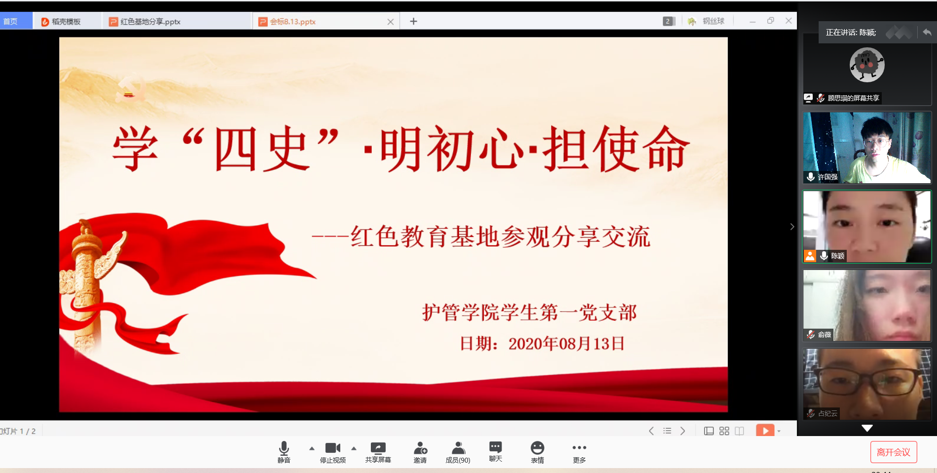 为贯彻落实习近平总书记重要讲话精神,进一步增强员工党员对党史、新中国史、改革开放史和社会主义发展史的认识,提高广大党员同志的政治素养和思想理论水平,2020年8月13日晚上8点,护管公司员工第一党支部通过腾讯会议开展了“学四史、守初心、担使命”组织生活会,分享交流了红色基地的参观感悟。