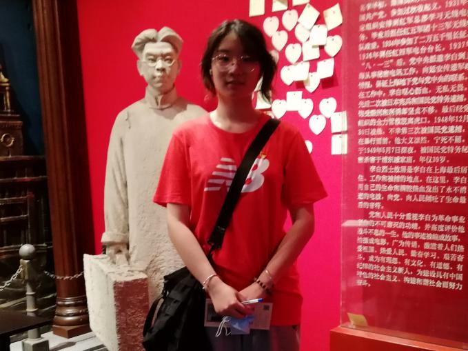 预备党员钟佳妮参观学习了李白烈士故居,她谈到,自己先前在上海国际舞蹈中心观看了名为《永不消逝的电波》的舞剧,这场舞剧是以李白烈士为代表的中共地下党员为原型,讲述了他们潜伏于隐蔽战线、行走与刀尖、最后将青春与生命献给党的事业和上海这座城市的故事,随后她被这些革命烈士敢于牺牲的精神和衷心为党的坚定信念所打动,因而抱着敬仰的态度于8.1建军节当天前往参观了李白烈士故居。她说道:“此次观剧和参观李白烈士故居的感悟我想用《永不消逝的电波》舞剧剧终的一句话概括——“长河无声奔去,唯爱与信念永存”。“长河”指上海的黄浦江,“无声”象征着历史与时间,“奔去”是人们精神层面的力量,唯独有了“爱”才能产生“信念”。走进李白烈士故居就像穿越了时空,在这里我重温了中国共产党走过的革命历程,感受到了初心和信仰的力量。”