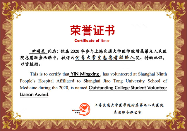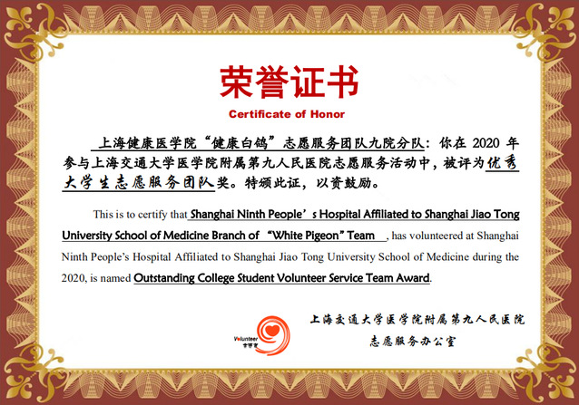 学期伊始,伟德bv国际体育官方网站“健康白鸽”志愿服务团队九院分队在志愿者服务方面取得不斐成绩。2020年,伟德bv国际体育官方网站“健康白鸽”志愿服务团队九院分队在上海交通大学附属第九人民医院志愿服务活动中,被评为“优秀老员工志愿服务团队”。同时,团队联络人尹明星在上海交通大学附属第九人民医院志愿服务互动中被评为“优秀老员工志愿者联络人”。此外,志愿者团队的陈淑婷、顾雨、梅诗婕、倪晓婷、谢吴鋆被评为“优秀老员工志愿者”。