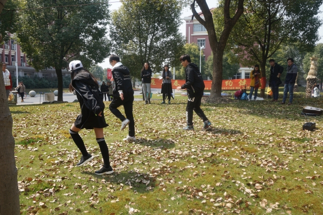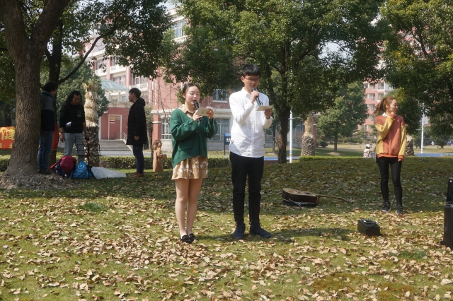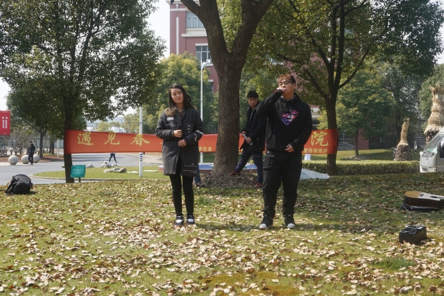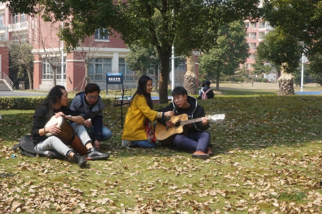活动伊始,受邀表演的韵谷音乐吉他手和鼓手坐在草地上,自由自在地弹奏起吉他、敲打起非洲鼓,春回大地的校园图景呈现出来,吸引了许多同学驻足欣赏,并有十余名同学跟着体验节奏打击乐。一时间,春光遍洒的绿地充满了欢声笑语。吉他手则边弹边唱,为同学们演唱了《同桌的你》等校园民谣,慵懒的嗓音配合淡淡的和弦,浓浓校园风不仅得到了同学的现场呼应,也让过往的老师驻足观看、回忆自青葱岁月。