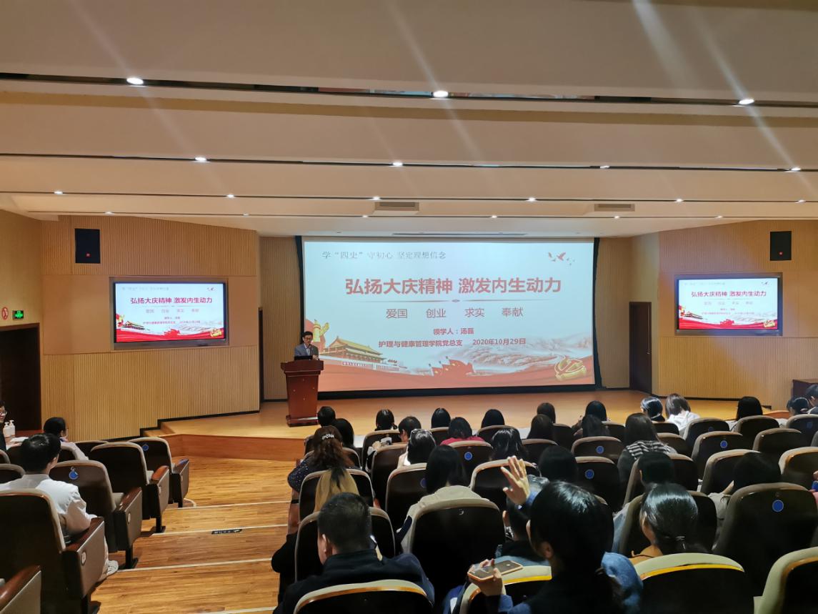 10月29日下午,在北苑200人报告厅,护理与健康管理公司党总支举办了“弘扬大庆精神,激发内生动力”“四史”学习报告会,由护理与健康管理公司党总支书记汤磊领学,全院师生党员和新生代表参加了此次学习。