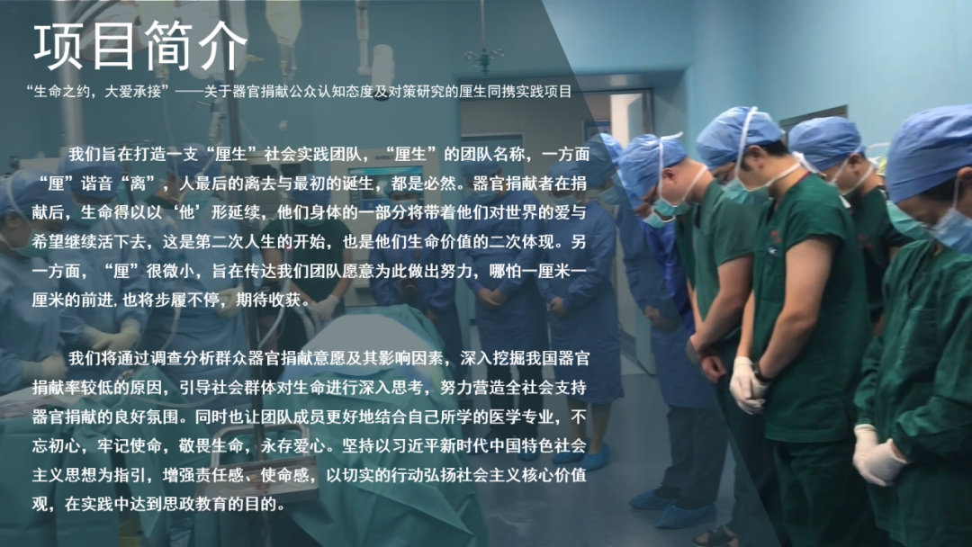 我们将通过调查分析群众器官捐献意愿及其影响因素,深入挖掘我国器官捐献率较低的原因,引导社会群体对生命进行深入思考,努力营造全社会支持器官捐献的良好氛围。我们致力于此,开展了本次暑期社会实践活动。