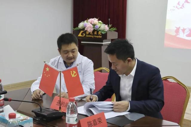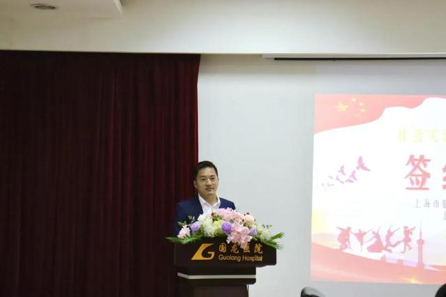 上海国龙医院经理王学明与伟德bv国际体育官方网站团总支书记宋飞进行签约仪式