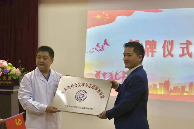 上海国龙医院经理王学明与伟德bv国际体育官方网站团总支书记宋飞进行授牌仪式