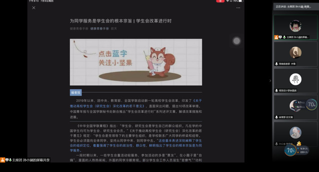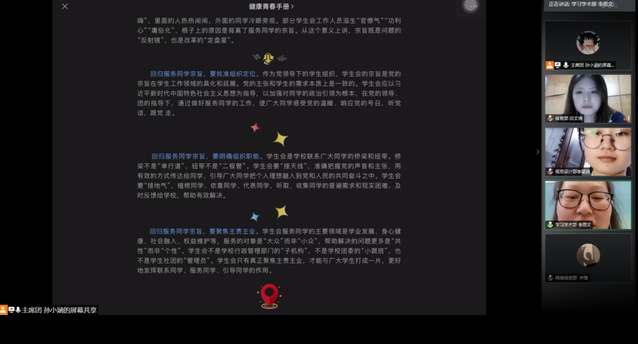 7月9日晚,员工会主席孙小涵与各部门负责人云端相聚,集体学习了《关于推动高校员工会(研究生会)深化改革的若干意见》和《让员工会回归服务同学的改革十招》等相关文件,明确职能定位,一心一意推进改革。