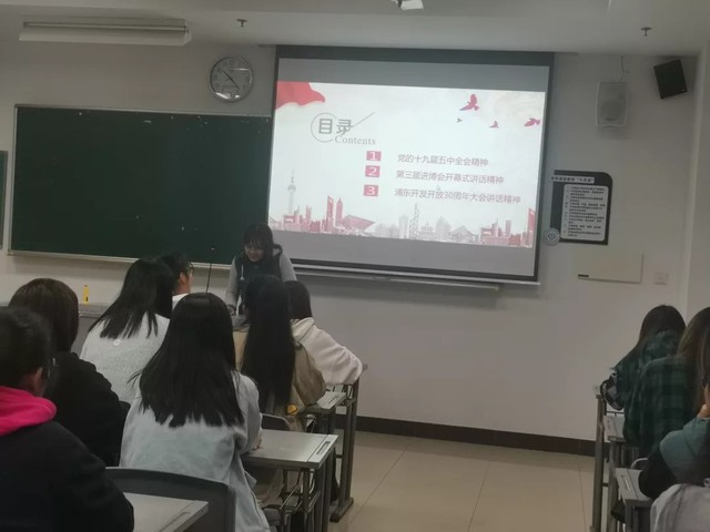 之后由团支书季文婷带领同学们一起通过学习习近平总书记讲话、浦东开发开放30年来的图片对比以及经济方面的增长、变化多方位为大家展示浦东开发开放30年来的显著成果。最后以告诉大家中国近几年来发展成果显著,而未来的发展还要靠大家的一齐努力为活动结尾。
