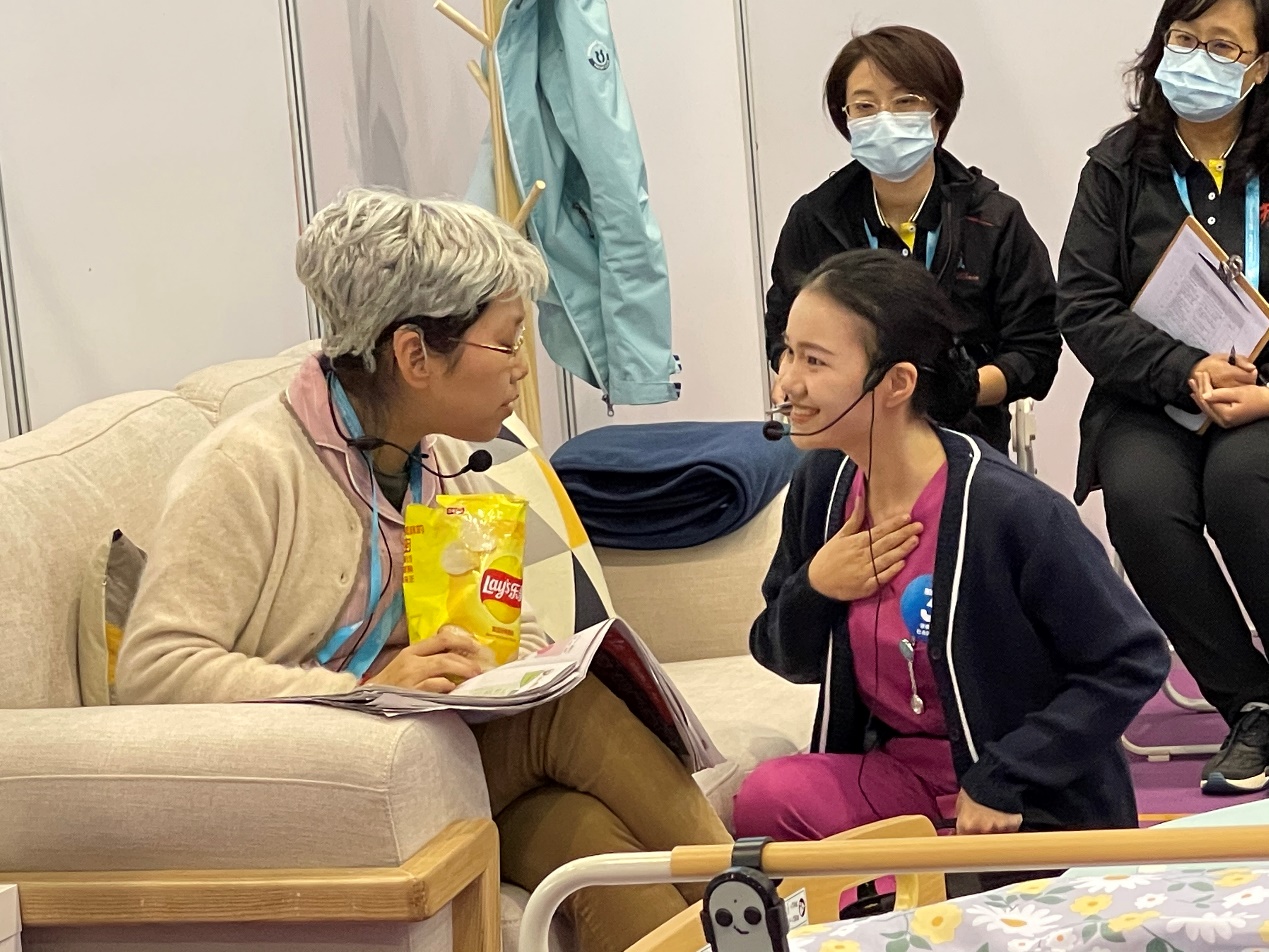两位选手在赛场中沉着冷静,得体大方,受到标准化病人和观众的啧啧称赞,得到裁判的一致认可,显示出健康和社会照护者的温暖与专业。