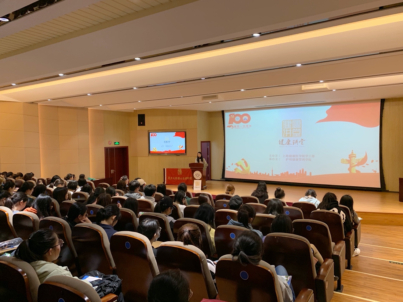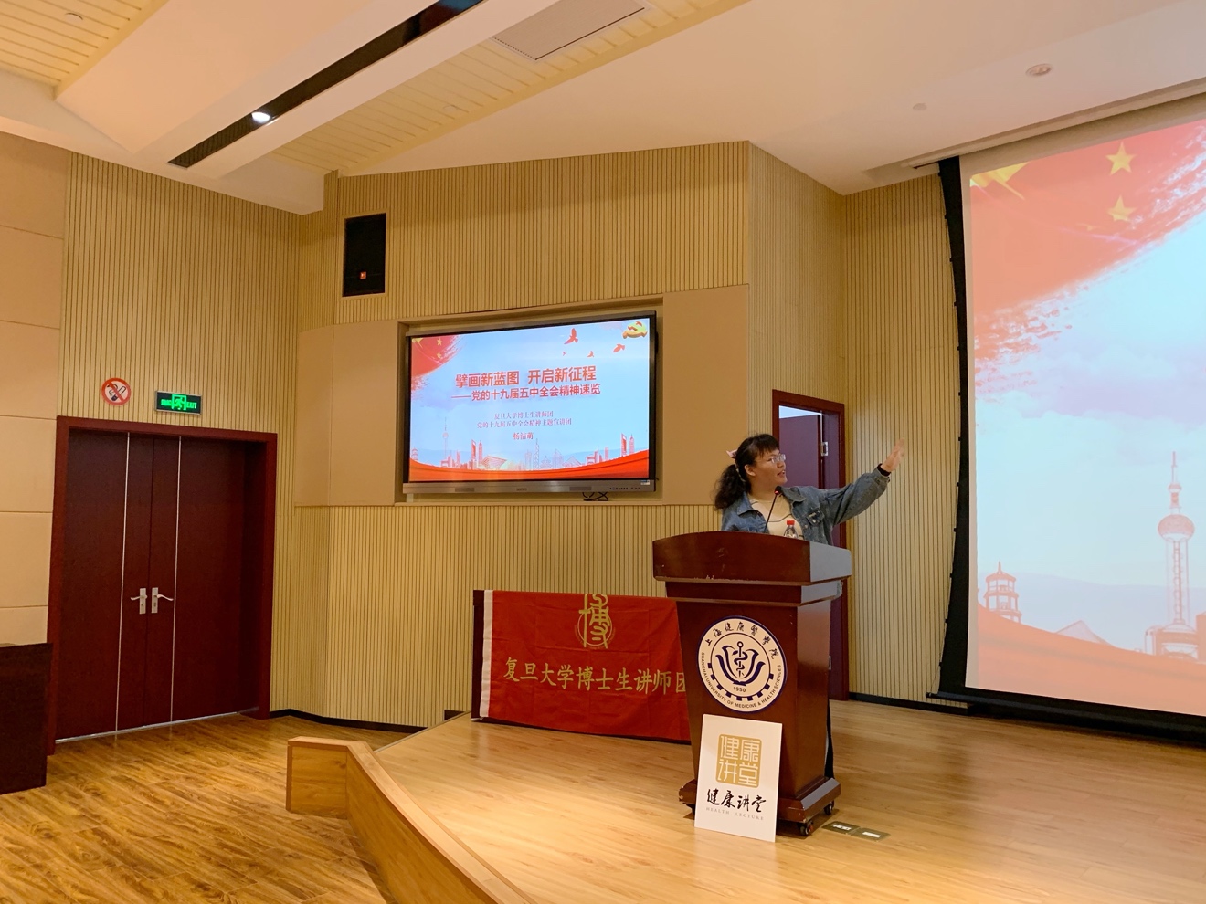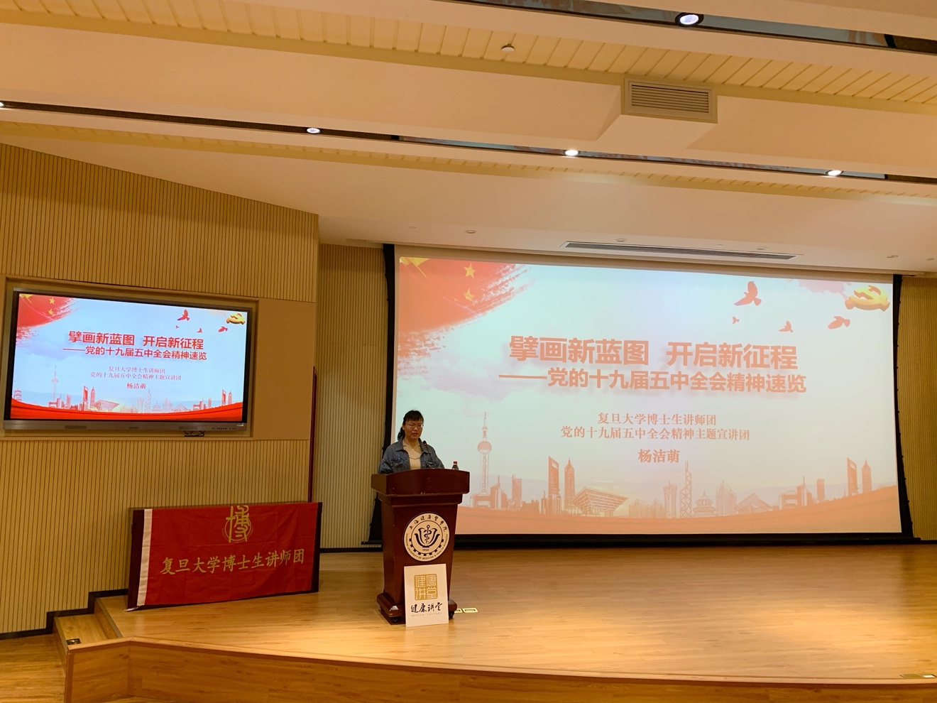 2021年4月22日下午14:00,在北苑1号楼两百人报告厅,伟德bv国际体育官方网站为更好地帮助同学们了解和学习党的十九届五中全会精神,组织了一场主题为“擘画新蓝图,开启新征程”的健康讲堂。讲座特别邀请了复旦大学博士生讲师团、党的十九届五中全会精神主题宣讲团的杨洁萌老师来引领大家了解此次讲堂。