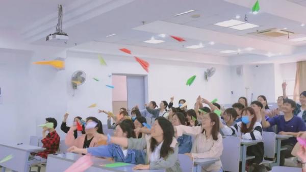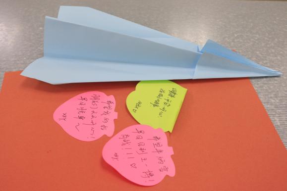最后,同学们在彩纸上写下自己的烦恼,叠成纸飞机一同去操场飞纸飞机,意寓让烦恼飞走,大家在放飞飞机的时候,不知不觉中笑容挂在了脸上,心中存在了很久的郁结都在飞机飞向蓝天的那一刻放下了。