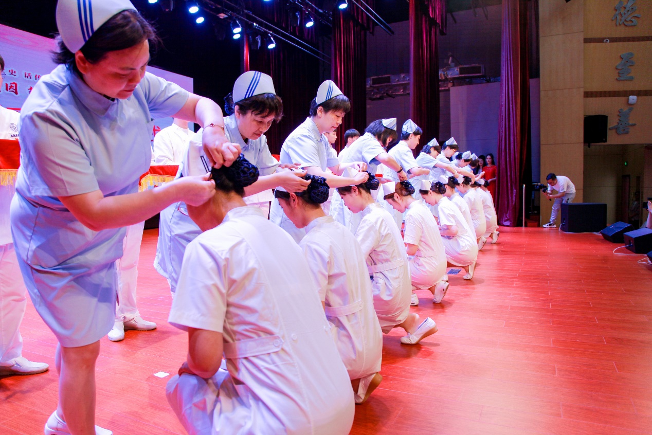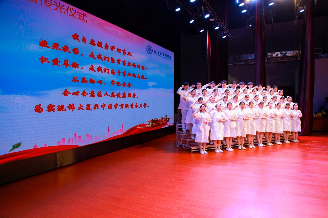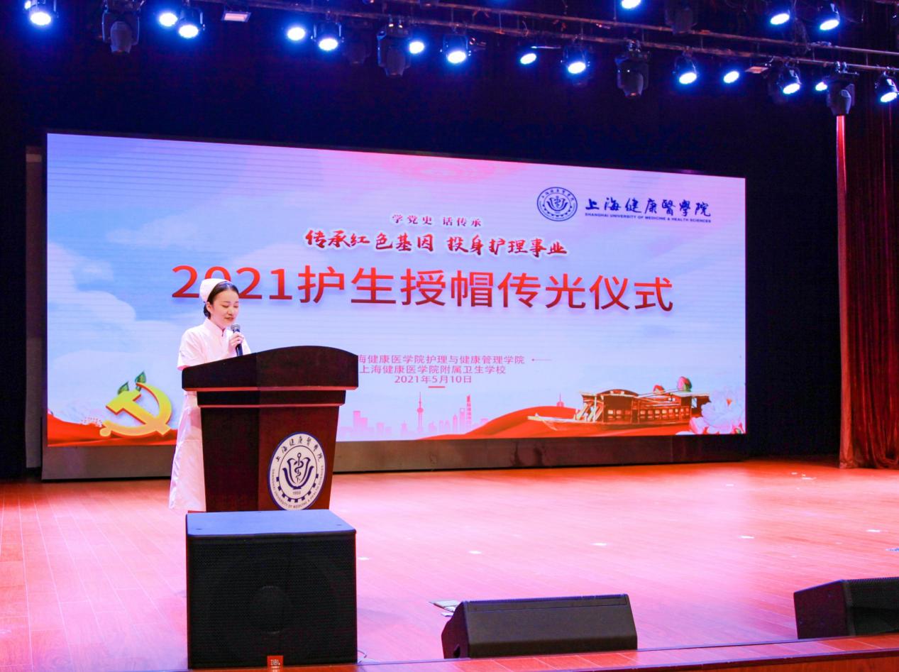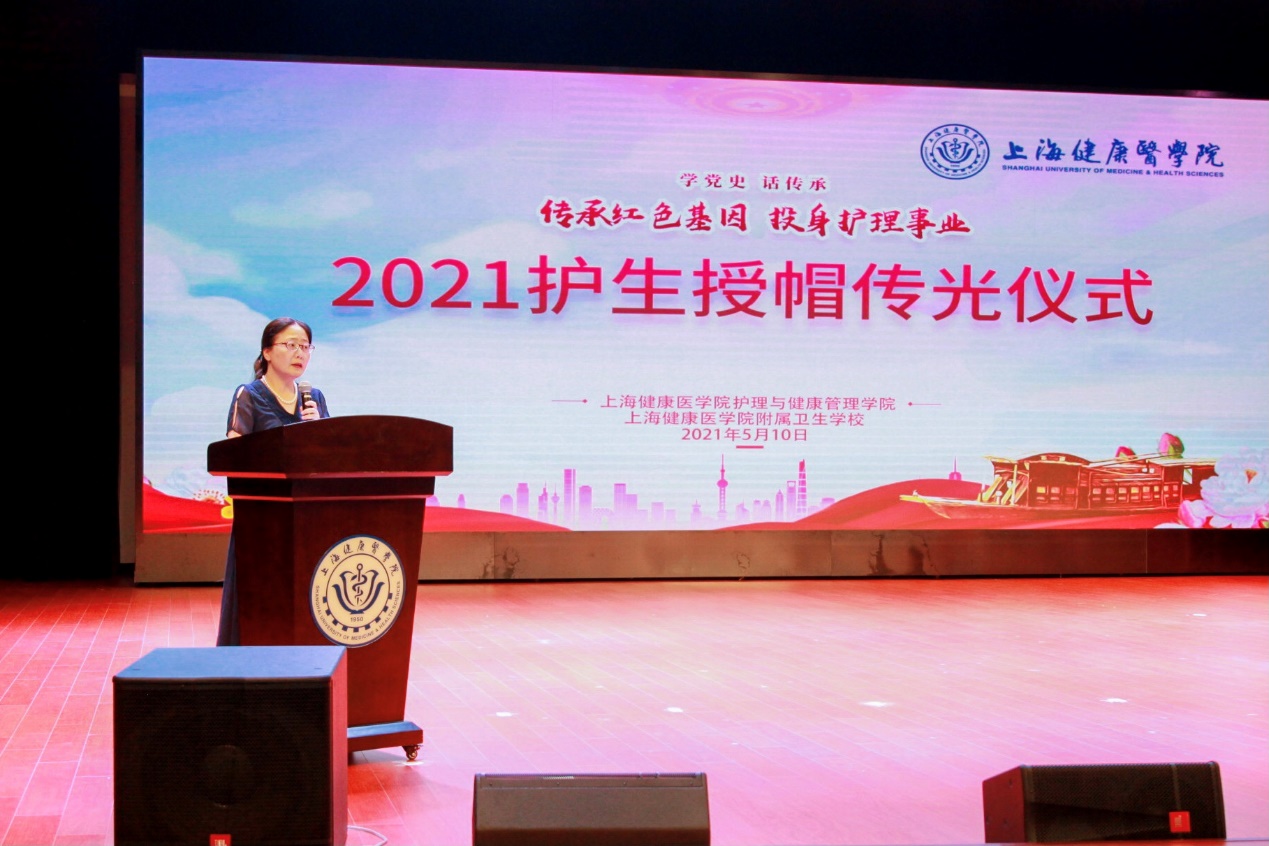 授帽传光仪式正式开始。上海市护理学会副理事长庹炎点燃象征生命之光的红烛,它是“点亮生命的航标,照亮前进道路”南丁格尔精神的象征。
