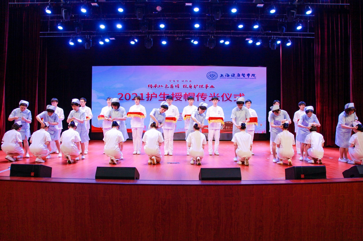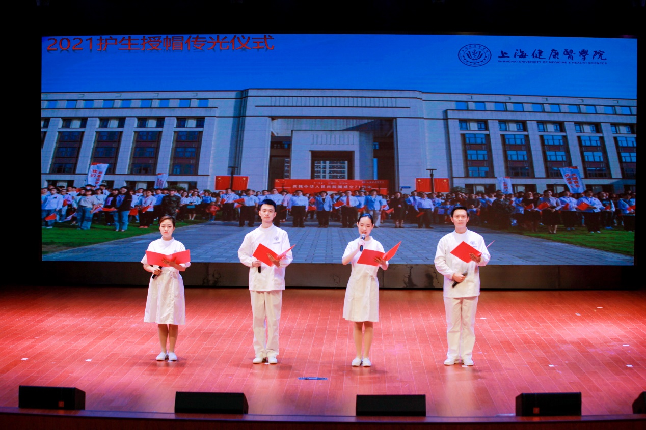 接着,由上海市护理学会副理事长庹炎、复旦大学附属中山医院护理部副主任秦薇、上海交大医公司附属仁济医院护理部副主任陈敏、复旦大学附属华山医院护理部副主任任学芳、上海交大医公司附属第六人民医院护理部副主任董芳辉、同济大学附属东方医院护理部主任张伟英、复旦大学附属上海市第五人民医院护理部主任顾艳荭、上海交通大学医公司附属国际和平妇幼保健院护理部主任李红、上海市精神卫生中心原护理部主任曹新妹、上海市浦东新区周浦医院护理部主任汤培凤共同为即将走上实习岗位的400多名护生代表授帽。